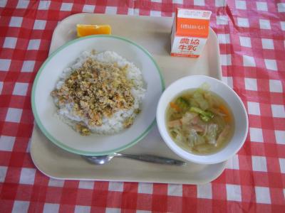 2025/6/27 ガパオライス、牛乳、野菜スープ、オレンジ
