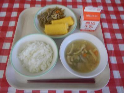 2025/6/30 ご飯、牛乳、出汁巻き玉子、きんぴらごぼう、里芋のみそ汁