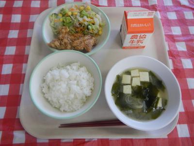 2025/7/1 ご飯、牛乳、鶏肉のごまからめ、ドレッシングサラダ、わかめのみそ汁