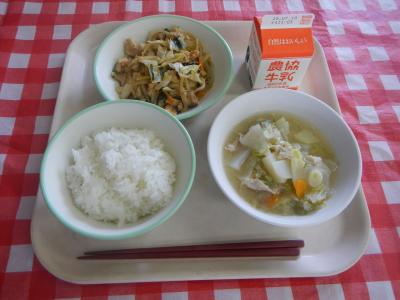 2025/7/2 ごはん、牛乳、キャベツと鶏肉の味噌炒め、豚汁
