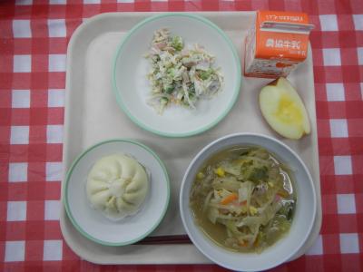 2024/11/28 肉まん、牛乳、ごまマヨサラダ、味噌ラーメン、りんご(支援品)