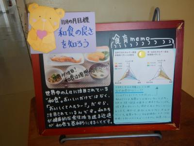 海外と比べると、圧倒的に脂質が低くて栄養価が高いのが和食の特徴ですが、近年の日本での食文化傾向は欧米化が進んでいます。意識して和食を選ぶことも健康に必要なことなので、掲示を作りました。