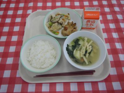 2024/6/11 ご飯、牛乳、鶏肉の梅焼き、高野豆腐の煮物、小松菜の味噌汁