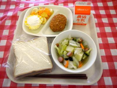 2024/6/13 セルフフルーツサンド、牛乳、野菜コロッケ、ポトフ