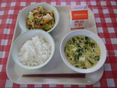2024/5/9 ご飯、牛乳、ホイコーロー、卵入りわかめスープ