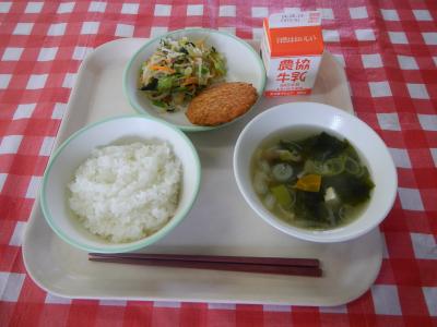 2024/5/13 ご飯、牛乳、ハムカツ、おかか和え、みそ汁