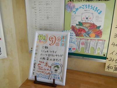 2023/11/9 本の日「うみのごちそうしろくま」ごはん、牛乳、ししゃもフライ、ハーフポテトサラダ、小松菜の味噌汁