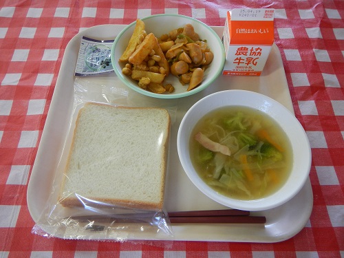 2025/4/17 食パン、牛乳、ウィンナーのケチャップがらめ、スパイシー豆ポテト、春キャベツのスープ、ブルベリージャム