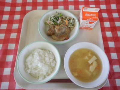2025/4/16 ご飯、牛乳、魚のピリ辛だれ、キャベツの梅和え、大根のみそ汁