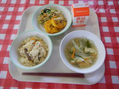 2025/4/9 山菜ごはん、牛乳、きのこ卵焼き、ごま和え、水菜のみそ汁