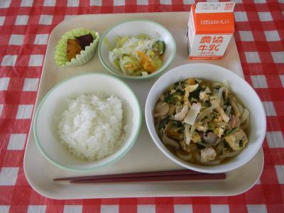 2025/4/11 ご飯、牛乳、親子うどん、あっさり漬け、ひと口揚げ芋