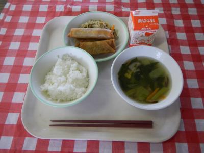 2025/4/15 ご飯、牛乳、春巻き、糸こんチャプチェ、しょうが風味の五色汁
