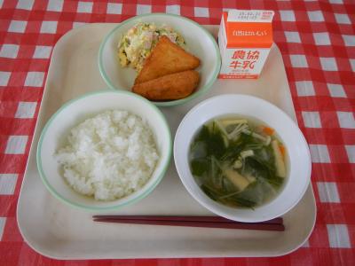 2025/2/17 ご飯、牛乳、チーズはんぺんフライ、ミモザサラダ、水菜のみそ汁