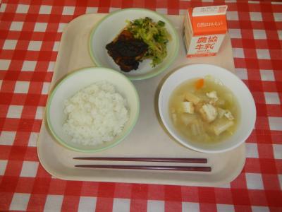 2025/2/18 ご飯、牛乳、鶏肉のごまみそ焼き、小松菜のり和え、厚揚げのみそ汁