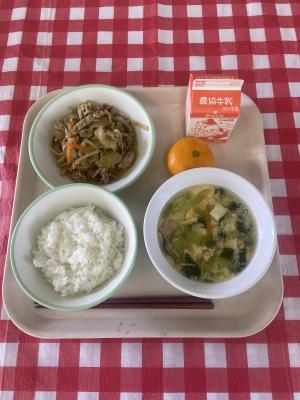 2025/2/19 給食試食会 ご飯、牛乳、チンジャオロースー、チンゲン菜の卵スープ