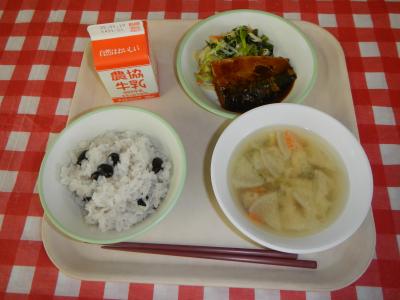 2025/12/13 黒豆ごはん、牛乳、さばの生姜煮、きゅうりの酢の物、ごぼうのみそ汁