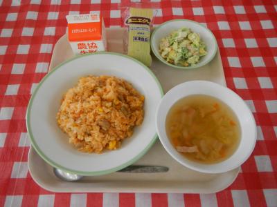2025/2/14 バレンタイン給食 チキンライス、牛乳、チーズサラダ、ベーコンスープ、ミニエクレア