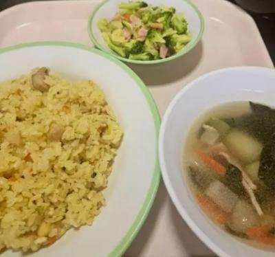 野菜がたくさん食べられるピラフを主食としました。スープも具沢山です。