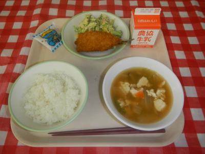 2025/2/3 節分給食 ごはん、牛乳、いわしフライ、大豆ツナマヨサラダ、けんちん汁、きなこボーロ福豆