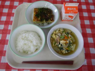 2025/2/4 ご飯、牛乳、手作りお好み焼き、車麩の卵とじ