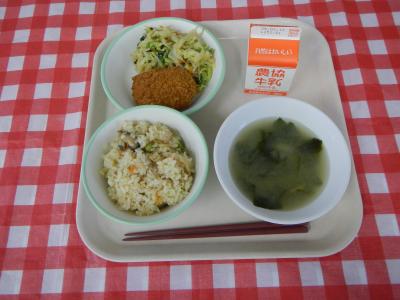2025/02/05 鶏五目ごはん、牛乳、野菜コロッケ、キャベツのごま和え、豆腐のみそ汁