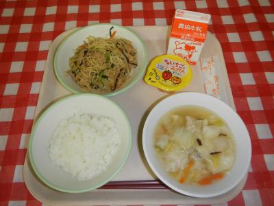 2025/1/15 ご飯、牛乳、ビーフンピリ辛炒め、わんたんスープ、いちごとピリ辛炒め
