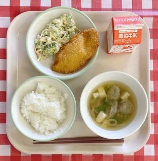 2026/1/28 ご飯、牛乳、鮭チーズフライ、白菜のおかか和え、小松菜のみそ汁