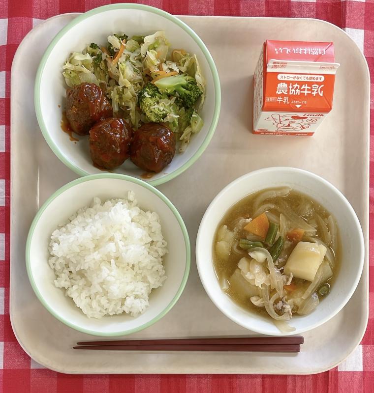 2026/1/27 ご飯、牛乳、鶏肉スタミナ炒め、豚汁、雪のポンデドーナッツ