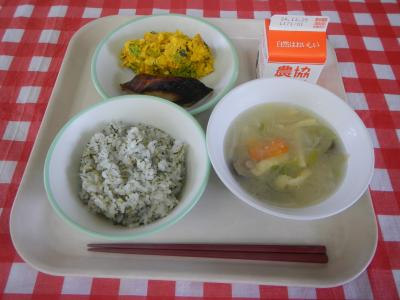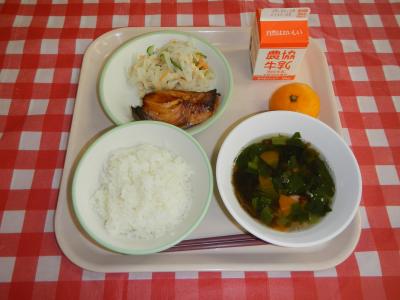 2024/12/19 中島菜飯、牛乳、ブリの幽庵焼き、かぼちゃサラダ、かす汁