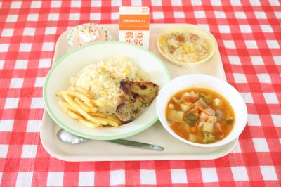 2024/12/24 シーフードピラフ、牛乳、ハニーマスタードチキン、フライドポテト、ミネストローネ、ミニロールケーキ