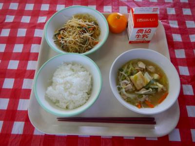 11/27 ご飯、牛乳、焼きビーフン、とり野菜、みかん