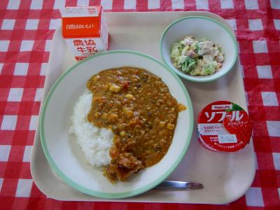 11/27 キーマカレー、牛乳、ドレッシングサラダ、福神漬け、ソフールいちご