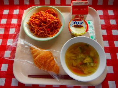 12/2 クロワッサン、牛乳、ミートソーススパゲティ、コンソメスープ、プリン