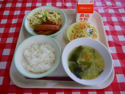 2025/7/17 ご飯、牛乳、ボイルウィンナー、千草和え、白菜のみそ汁