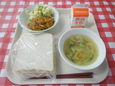 2024/3/12 食パン、牛乳、煮込みハンバーグ、枝豆コーンポテト、ベーコンのスープ