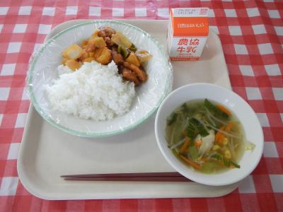 2024/3/13 ご飯、牛乳、酢豚、中華スープ