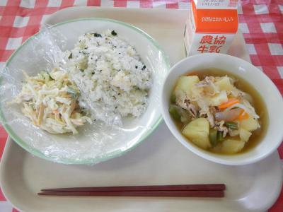 梅わかめご飯、牛乳、イカ君サラダ、肉じゃが