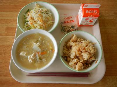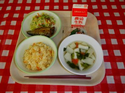 2025/5/2 たけのこご飯、牛乳、いわしのみぞれ煮、昆布和え、はんぺんのすまし汁、かしわもち
