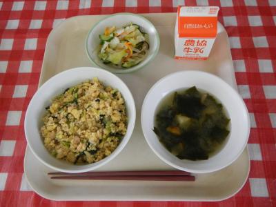 2025/4/28 そぼろ丼、牛乳、塩昆布和え、わかめのみそ汁