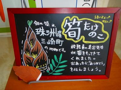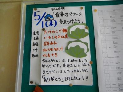 珠洲市三崎町産のたけのこがたっぷり入った「たけのこご飯」、こいのぼりに見立てた「いわしのみぞれ煮」、デザートは「かしわ餅」が付きました。
