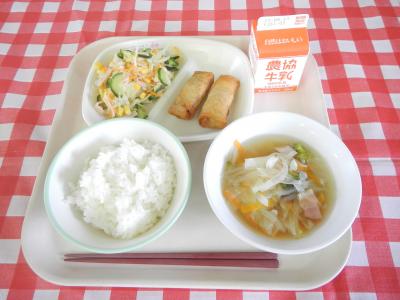 2023/5/8 ごはん、春巻き、いしるレモンサラダ、野菜スープ