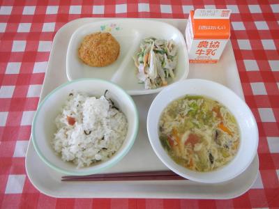 2023/5/10(水)しらす入り梅ごはん、メンチカツ、ごぼうサラダ、トマトレタススープ