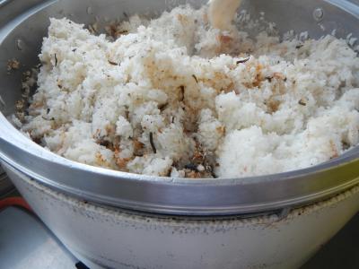 しらす入梅ごはんには、梅干し、さざなみ、ごま、しらすを混ぜ込んであります。