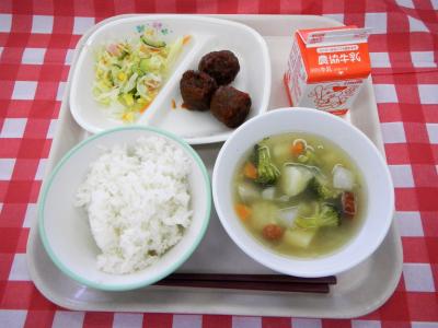 ごはん、牛乳、肉団子、ドレッシングサラダ、ポトフ
