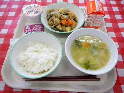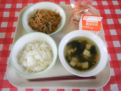 ごはん、牛乳、いりどり、みそ汁、ふりかけ、デザート