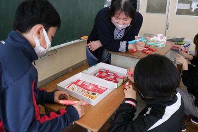 生徒と一緒にメッセージを各作業が、とっても楽しかったです!小学校の生徒に届いた時の顔が楽しみです♪