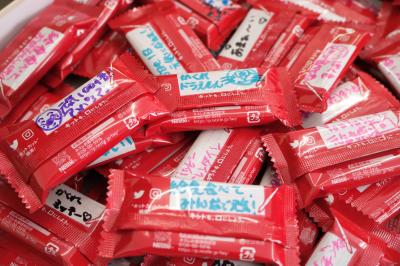 小学校へのキットカットには、中学校1年生と先生のメッセージを手書きしました。