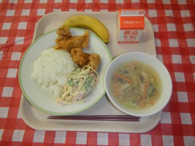 2024/2/5 ごはん、牛乳、から揚げ、スパゲティサラダ、キャベツのコンソメスープ