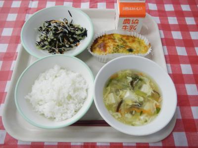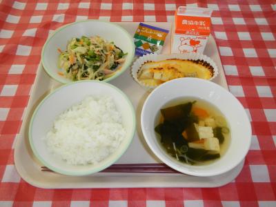 2023/12/15 ご飯、牛乳、かぼちゃグラタン、ひじきのマリネ、卵スープ