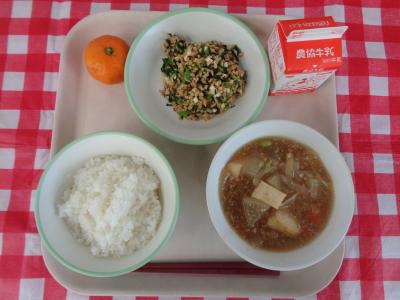 2023/12/18 ご飯、チーズ納豆、大根のそぼろ煮、みかん